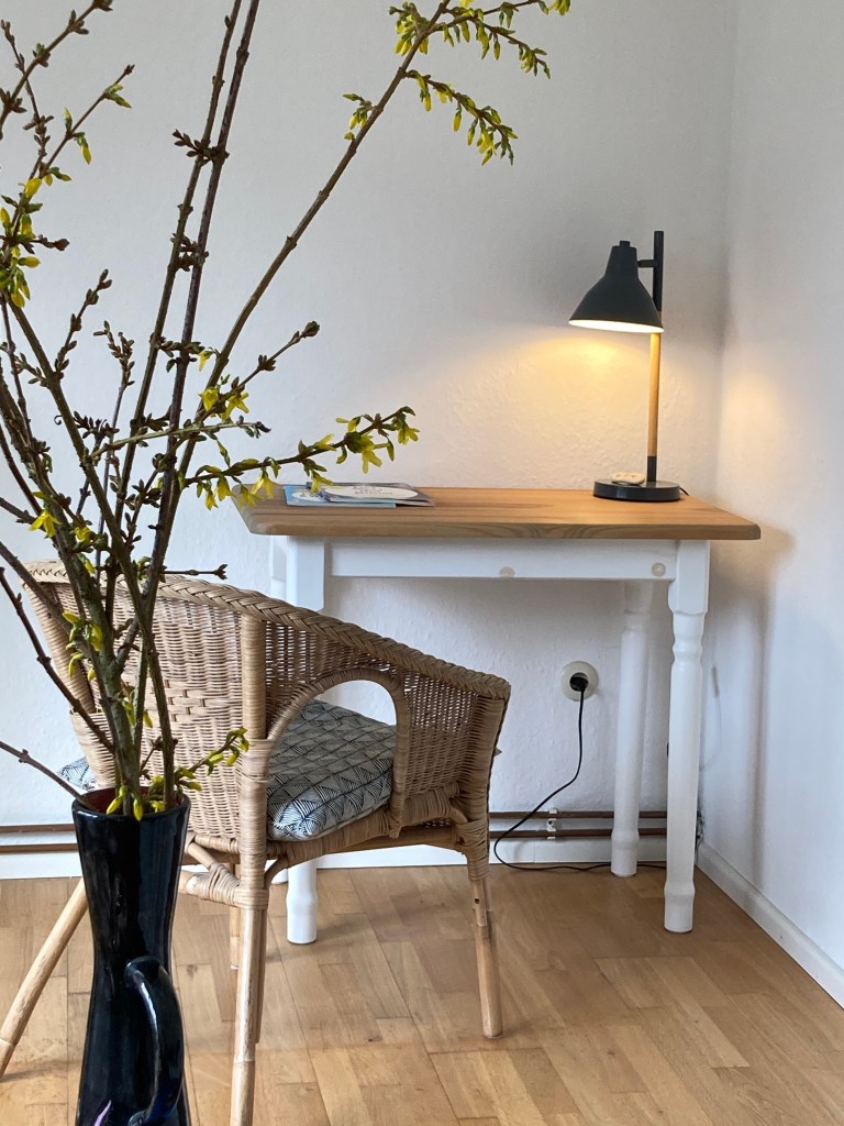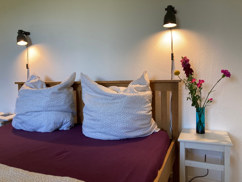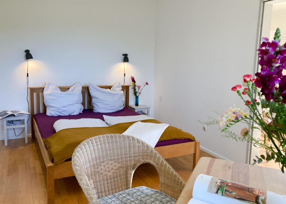 Wer es ruhig mag und vom Schlafzimmer aus auf das Feld blicken möchte, ist hier gut aufgehoben. Diese ruhige Wohnung für 2 Personen liegt im Anbau, zusammen mit der Wohnung A, und hat eine Grundfläche von ca. 45 qm. Es gibt dort einen kleinen Garten und eine Terrasse, die mit der Wohnung A gemeinsam genutzt werden. Das Schlafzimmer hat ein Doppelbett (160 x 200 cm). einen kleinen Schreibtisch mit Korbsessel und eine Kommode. Ein Kinderbett lässt sich bequem dazu stellen. Das zweite Zimmer hat einen schönen Kaminofen, ein Sofa, einen Kleiderschrank, eine Kommode und einen Couchtisch. Es ist gleichzeitig das Eingangszimmer der Wohnung und ist direkt verbunden mit dem Schlafzimmer, durch welches man gehen muss, um in die Küche oder das Bad zu gelangen. Die Küche hat einen gemütlichen offenen Sitzbereich, einen Kühlschrank mit kleinem Gefrierfach, einen 4-Platten-Herd mit Backofen und eine Spüle. Das Bad hat ein Waschbecken, eine Dusche und ein WC.
